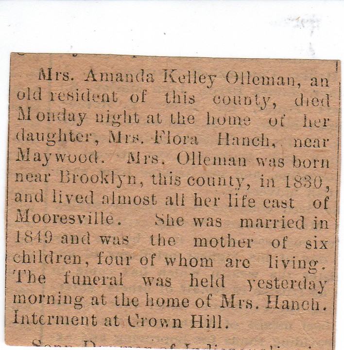 Other Buried in Crown Hill cemetery beside her father. Parents: Eliza Whetzel Kelly and James Smith Kelly. James was a soldier in the War of 1812. Mrs. Olleman was the mother of six children, two of whom preceded her in death.