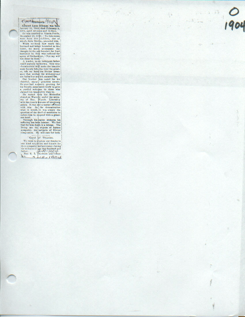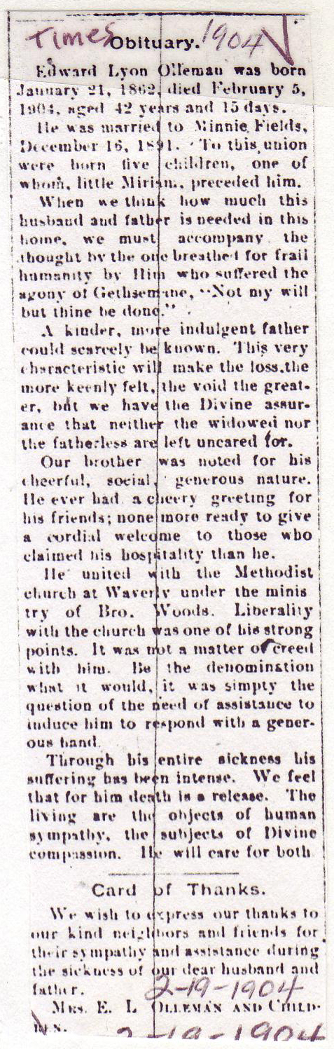 | Other | Age 42. Parents: Ezra A. and Amanda Kelley Olleman. Father of 5 children. (Daughter Miriam has died.) Died unexpectedly at Landersdale. |