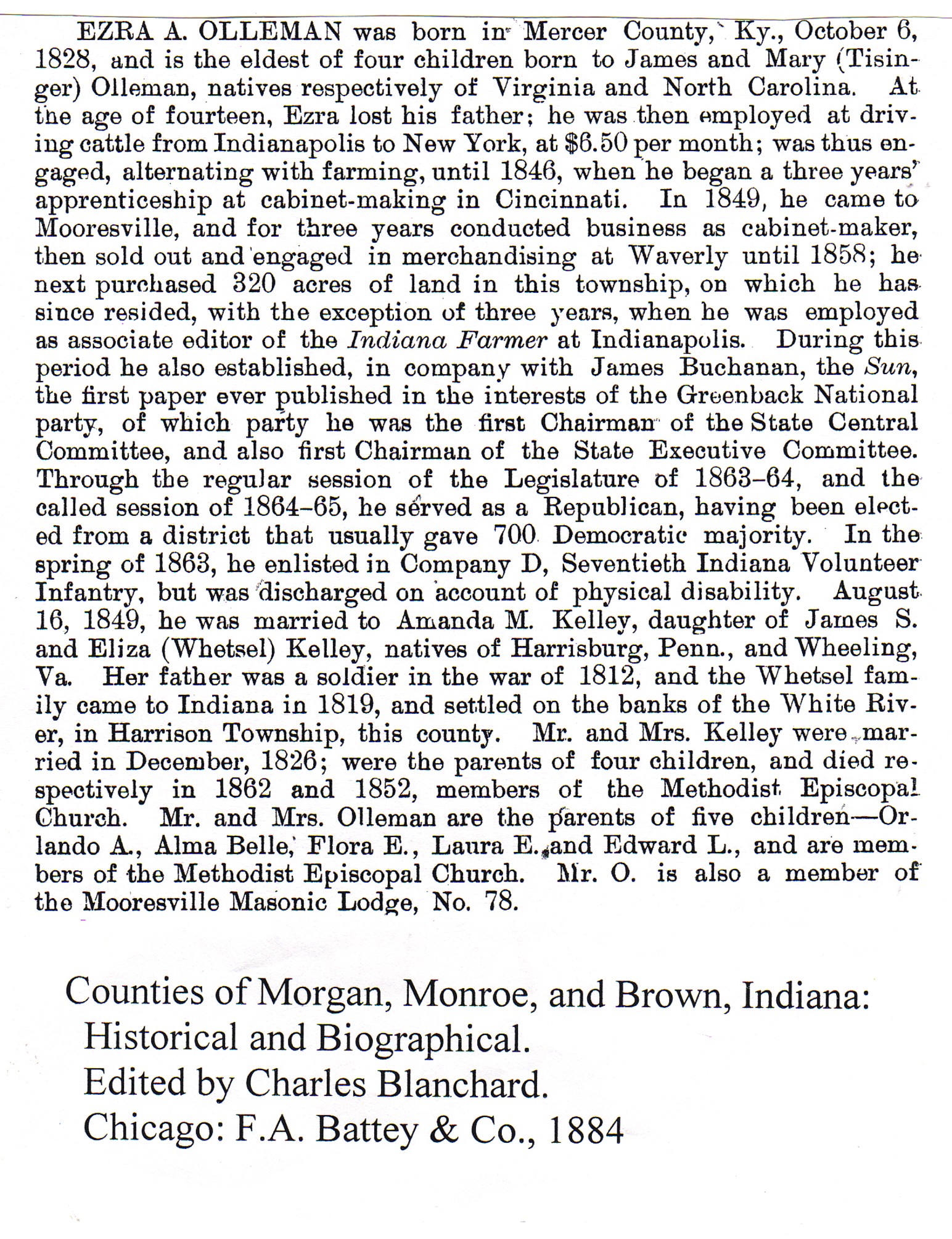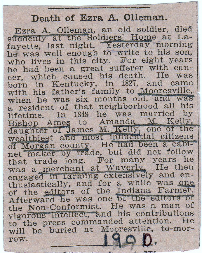 Other Age 73. Died in Soldiers' Home at Lafayette. Buried in Mooresville on June 23. Wife was daughter of James S. and Eliza Whetzel Kelly. He and Amanda filed for divorce in February 1895. Veteran of the Civil War: Co. D, 70th Indiana. Born in Mercer Co., Ky. Father of 6 children, two of whom preceded him in death. Children: Orlando A., Elma Belle, Flora E., Laura E. (twin sister of Flora), and Edward.
