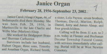 | Survived By | Spouse; 3 sons, Timothy and Jonathan Organ, and Richard Smith; sister, Lola Payton; 7 brothers, Thomas, David, Marion, Ralph, Daniel, Jerry, and James Alsup; 4 grandchildren. |