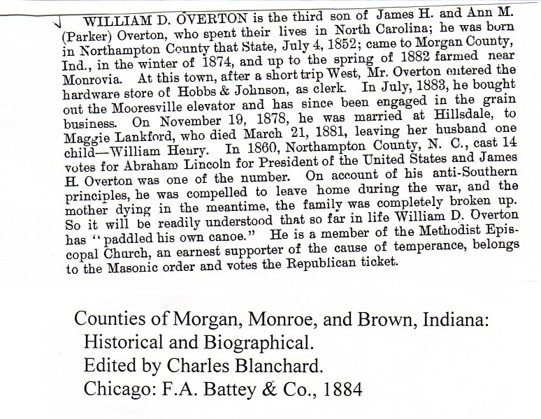 Other Born in Northampton Co., N.C. Parents, James H. and Ann M. Parker Overton of N.C. Left home during the Civil War because of his anti-Southern principles; his mother then died. Came to Morgan Co. in 1874. Clerked in hardware store. Bought Mooresville Elevator (grain) in July 1883. Methodist Church. Republican, Mason. Married Maggie Lankford on Nov. 19, 1878, at Hilldale. They had one child, William Henry. Maggie died March 21, 1881.