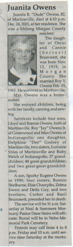 | Other | Preceded in death by parents, Oscar and Cannie (Secrest) Brummett; son, Sparky Eugene Owens; sisters, Bonnie Shelburne, Elsie Champlin, Zelma Ewers, and Della Guy; brothers, Corbet and Basil Brummett. |