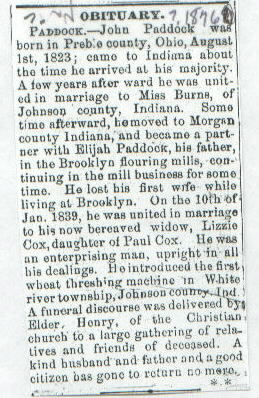 | Other | Father, Elijah Paddock, was his partner in Brooklyn flouring mills. John introduced first wheat threshing machine in White River Twp., Johnson Co., Ind. |