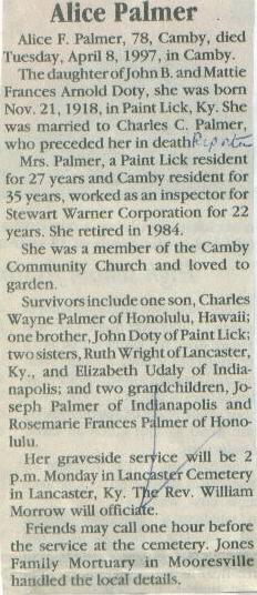 | Survived By | Son, Charles Wayne Palmer of Hawaii; brother, John Doty of Paint Lick, Ky.; 2 sisters; 2 grandchildren. |