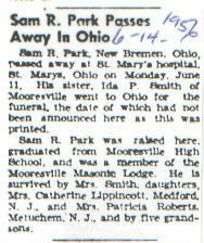 | Other | Died in Ohio. Stone in Park family plot, Mooresville Cemetery: "Resting in Wauseon, Ohio." |