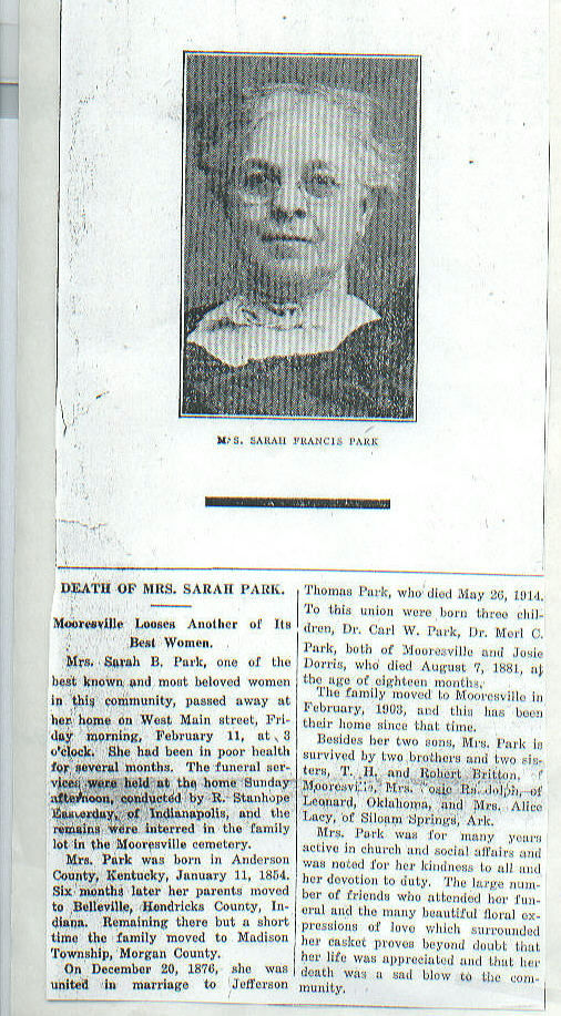 | Survived By | Sons, Dr. Carl W. and Dr. Merle C. Park; sisters, Mrs. Josie Randolph and Mrs. Alice Lacy; brothers, Thomas Harvey and Robert W. Britton. |