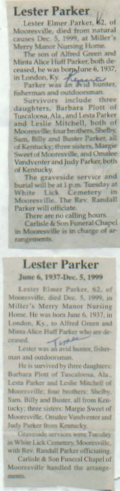 | Other | Age 62. Carlisle graveside service; burial White Lick cemetery. Parents: Alfred Green and Minta Alice Huff Parker. Hunter, fisherman, and sportsman. Died at Miller's Merry Manor; born in London, Ky. |