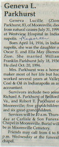 Other Age 83. Carlisle Chapel. Buried Mooresville Cemetery. Parents: Oscar E. and Ella May Barnes Zion. Died in Westview hospital; born in Indianapolis.