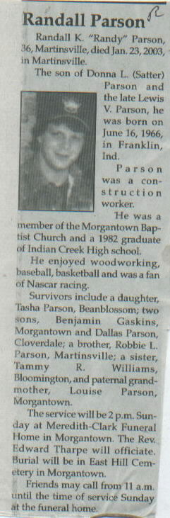 | Survived By | Mother, Donna L. (Satter) Parson; daughter, Tasha Parson; 2 sons, Benjamin Gaskins and Dallas Parson; brother, Robbie L. Parson; sister, Tammy R. Williams; paternal grandmother, Louise Parson. |