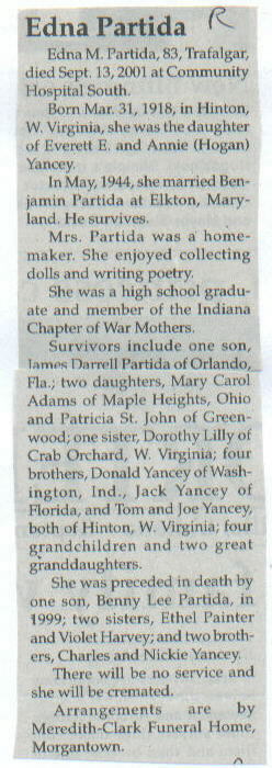 | Other | Preceded in death by parents, Everett E. and Annie (Hogan) Yancey; son, Benny Lee Partida; sisters, Ethel Painter and Violet Harvey; brothers, Charles and Nickie Yancey. |
