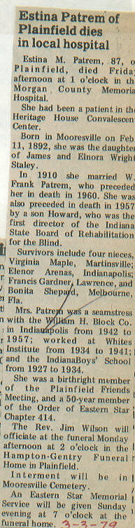 | Other | Age 87. Hampton Gentry Funeral Home, Plainfield (Rev. Jim Wilson.) Buried Mooresville Cemetery. Parents: James and Elnora Wright Staley. Birthright member Plainfield Friends meeting. |