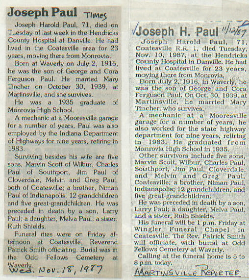 | Obituary Source | Martinsville Reporter, Nov. 12, 1987 |