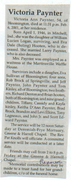 | Survived By | Father, William Lucien Logan; daughter, Eva Sullivan; sons, Rob Brock, Jeff, and John Paynter, and Tom Kinley; brothers, Richard Denton and Brian Hooten; 9 grandchildren. |