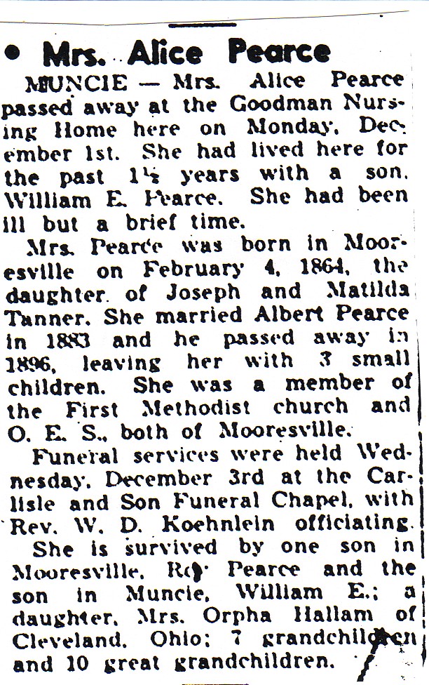 Survived By 2 sons, Will of Muncie and Roy of Mooresville; 1 daughter, Mrs. Orpha Hallam of Cleveland, Ohio; 7 grandchildren; 10 great-grandchildren.