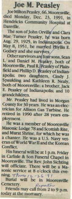 | Other | Age 66. Carlisle Chapel (Rev. John Sichting.) Buried Mooresville Cemetery. Parents: John Orville and Clara Mae Turner Peasley. Lived in Morgan Co. 30 years. Veteran US Navy, World War II and Korean War. Died at Hendricks Co. hospital. |