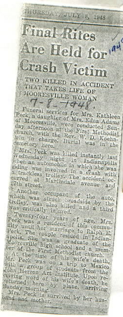 | Other | Age 24. Funeral at First Methodist Church. Buried Mooresville Cemetery. Fatally injured in auto/trolley accident at Martindale Ave. & 17th St., Indianapolis. Another occupant of auto killed, and a third critically injured. Graduate of Mooresville HS. |
