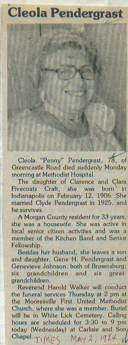 Survived By Husband; son, Gene H. Pendergrast; daughter, Genevieve Johnson, both of Brownsburg; 6 grandchildren; 6 great-grandchildren.