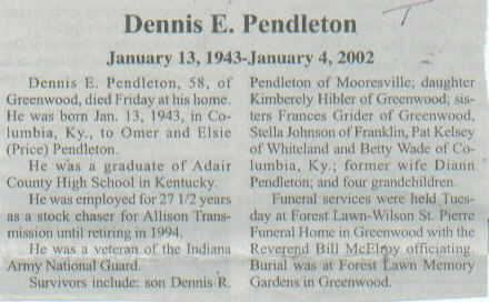 | Survived By | Son, Dennis R. Pendleton; daughter, Kimberely Hibler; sisters, Frances Grider, Stella Johnson, Pat Kelsey, and Betty Wade; former wife, Diann Pendleton; 4 grandchildren. |