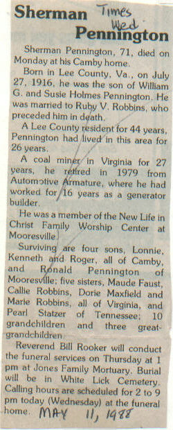 | Survived By | 4 sons, Lonnie, Kenneth, Roger, and Ronald Pennington; 5 sisters, Maude Faust, Callie Robbins, Dorie Maxfield, Marie Robbins, and Pearl Statzer; 10 grandchildren; 3 great-grandchildren. |