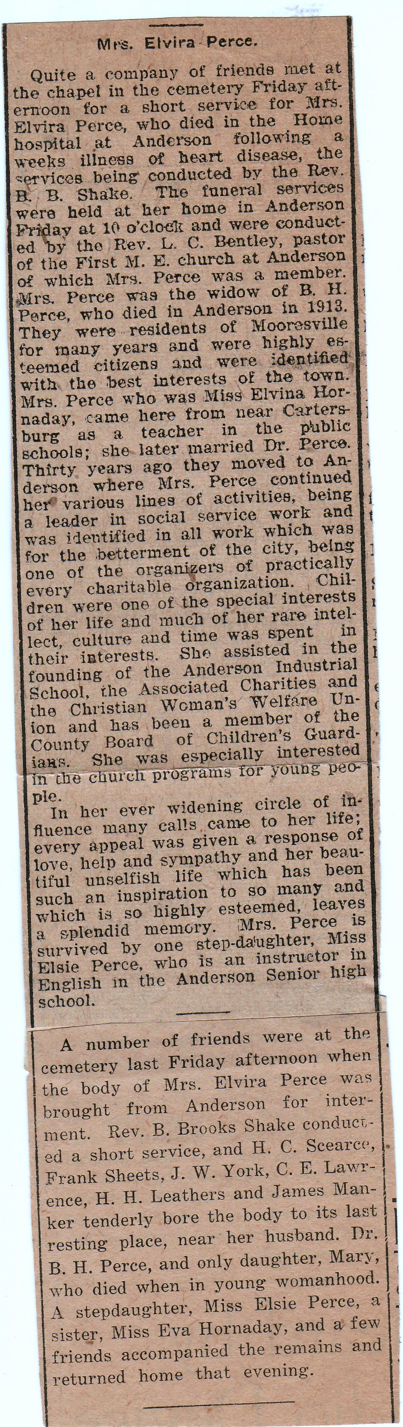 | Survived By | Daughter, Miss Elsie Perce; 2 sisters, Mrs. Manta Rawlings and Miss Eva Hornaday. |