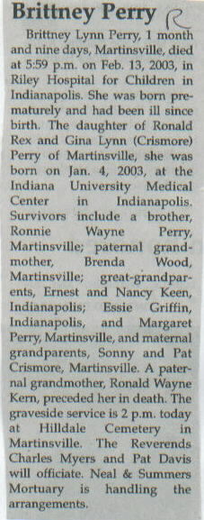 Survived By Parents, Ronald Rex and Gina Lynn (Crismore) Perry; brother, Ronnie Wayne Perry; paternal grandmother, Brenda Wood; great-grandparents, Ernest and Nancy Keen, Essie Griffin, and Margaret Perry; maternal grandparents, Sonny and Pat Crismore.