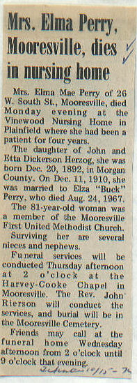 | Other | Age 81. Harvey-Cooke funeral. Buried Mooresville Cemetery. Died Vinewood Nursing home, Plainfield. Parents: John and Etta Dickerson Herzog. Member Methodist Church. Lived at 26 W. South St., Mooresville. |