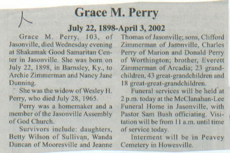 | Survived By | Daughters, Betty Wilson, Wanda Duncan, and Jeanne Thomas; sons, Clifford Zimmerman, Charles Perry, and Donald Perry; brother, Everett Zimmerman; 23 grandchildren; 43 great-grandchildren; 18 great-great-grandchildren. |