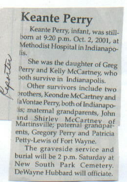 Survived By Parents, Greg Perry and Kelly McCartney; brothers, Keondre McCartney and Vontae Perry; grandparents.
