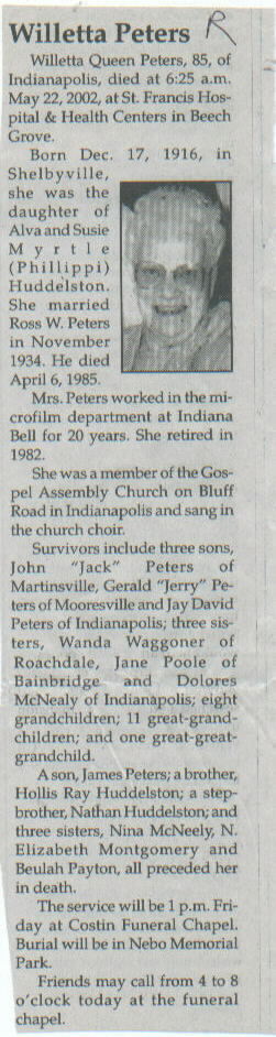 | Other | Daughter of the late Alva and Susie Myrtle (Phillippi) Huddelston. Preceded in death by a son, James Peters; a brother, Hollis Ray Huddelston; a stepbrother, Nathan Huddelston; and three sisters, Nina McNeely, N. Elizabeth Montgomery, and Beulah Payton. |