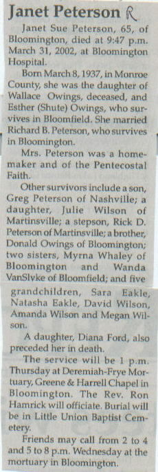 | Survived By | Spouse; mother, Esther (Shute) Owings; son, Greg Peterson; daughter, Julie Wilson; stepson, Rick D. Peterson; brother, Donald Owings; 2 sisters, Myrna Whaley and Wanda Van Slyke; 5 grandchildren, Sara Eakle, Natasha Eakle, David Wilson, Amanda Wilson, and Megan Wilson. |