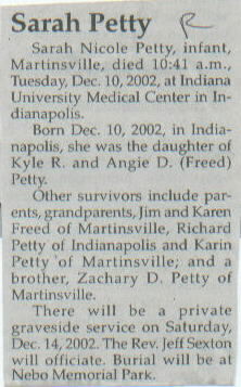 Survived By Parents, Kyle R. and Angie D. (Freed) Petty; grandparents, Jim and Karen Freed, Richard Petty of Indianapolis, and Karin Petty of Martinsville; brother, Zachary D. Petty.
