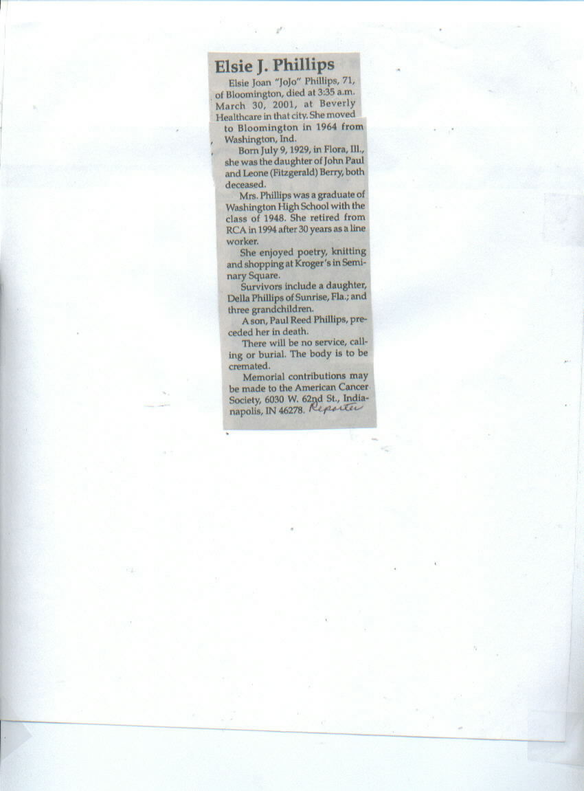 | Other | Age 71. Preceded in death by parents, John Paul and Leone (Fitzgerald) Berry; son, Paul Reed Phillips. Cremation. |