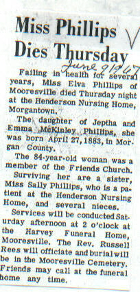 | Other | Age 84. Harvey Funeral Home (Rev. Russell Rees of Quaker Church officiating.) Buried Mooresville Cemetery. Member Friends Church. Parents: Jeptha and Emma McKinley Phillips. |