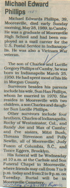 | Other | Age 39. Carlisle Chapel. Buried Mooresville Cemetery. Graduate Mooresville HS. Vietnam War veteran. Employed US Postal service, Indianapolis. Parents: Charles and Lucille Gregory Phillips of Camby. |