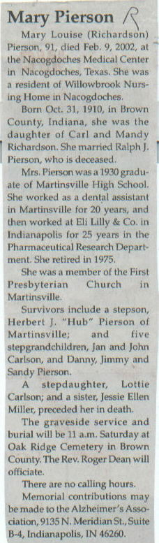 | Other | Age 91. Daughter of Carl and Mandy Richardson. A stepdaughter, Lottie Carlson, and a sister, Jessie Ellen Miller, preceded her in death. |