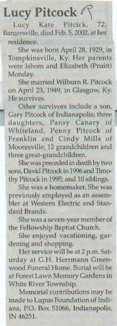 | Survived By | Spouse; son, Gary Pitcock; 3 daughters, Pansy Canary, Penny Pitcock, and Cindy Mills; 12 grandchildren; 3 great-grandchildren. |