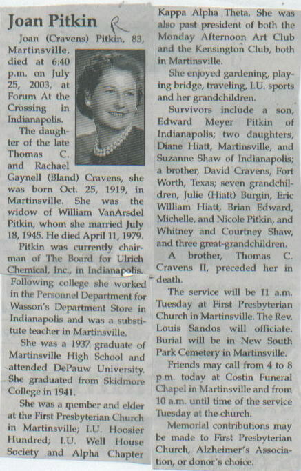 Survived By Son, Edward Meyer Pitkin; 2 daughters, Diane Hiatt and Suzanne Shaw; brother, David Cravens; 7 grandchildren, Julie (Hiatt) Burgin, Eric William Hiatt, Brian Edward, Michelle, and Nicole Pitkin, and Whitney and Courtney Shaw; 3 great-grandchildren.