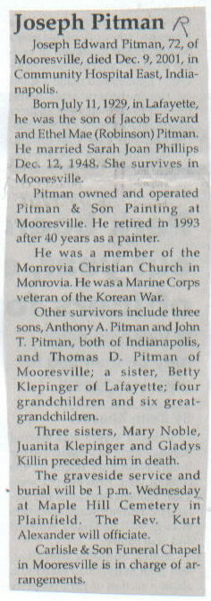 Other Preceded in death by parents, Jacob Edward and Ethel Mae (Robinson) Pitman; sisters, Mary Noble, Juanita Klepinger, and Gladys Killin.
