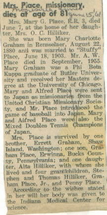 Other Age 81. Cause of death: drowning. Harvey funeral home. According to her wishes, her body was given to Indiana Medical Center for scientific research. Graduate Butler Univ.; Masters degree from U. of Chicago. She and her husband were missionaries to Japan; introduced baseball there. They were also mixed doubles tennis champions of Japan.