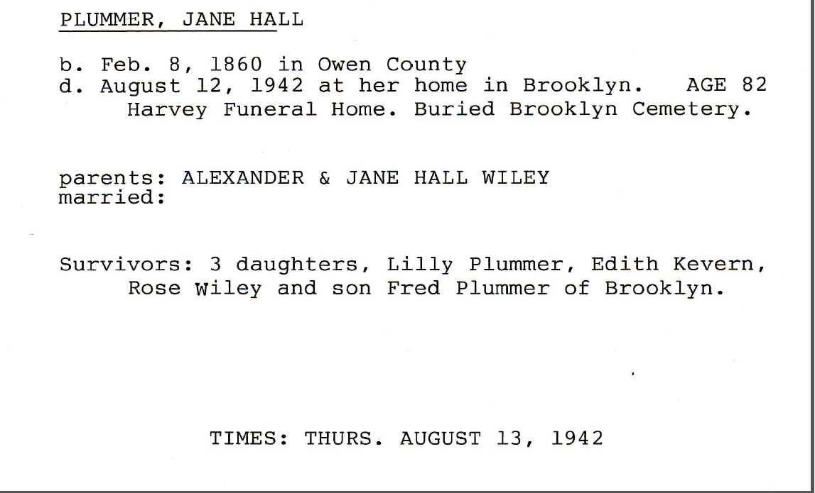 Other Age 82. Harvey Funeral Home. Parents: Alexander and Jane Hall Wiley. Died at Brooklyn; born in Owen County.