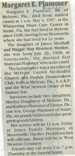 | Other | Age 88. Jones Mortuary. Buried West Newton cemetery. Died at Whispering Pines Care Center in Starke, Fla. Lived in Mooresville 22 years; moved to Florida in 1948. Born at Greencastle. |