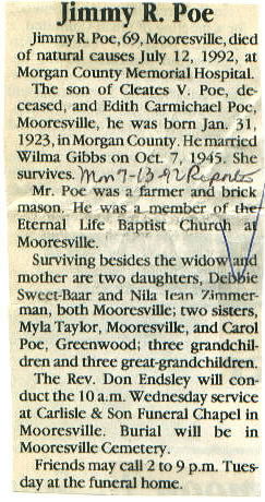 | Survived By | Wife; daughters, Debbie Sweet-Baar and Nila Jean Zimmerman; sisters, Myla Taylor and Carol Poe. |