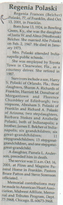 | Survived By | Son, Harry S. Polaski; daughters, Sharon A. Richards, Harriett M. Donahue, and Florence Chumbley; brother, James E. Belcher; 6 grandchildren; 6 great-grandchildren; stepchildren; stepgrandchildren and stepgreat-grandchildren. |