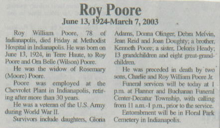 | Other | Veteran of the U.S. Army, WW II. Preceded in death by two sons, Charlie and Roy William Poore, Jr. Born in Terre Haute to Roy Poore and Ora Belle (Wilson) Poore. |