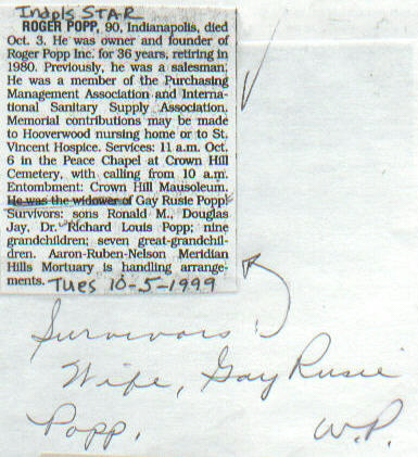 | Survived By | Widow, Gay; sons, Ronald M., Douglas J., and Dr. Richard Louis Popp; 9 grandchildren; 7 great-grandchildren. |