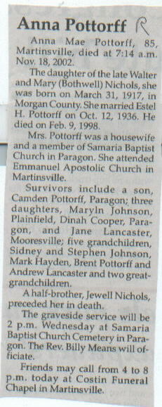 | Survived By | Son, Camden Pottorff; 3 daughters, Maryln Johnson, Dinah Cooper, and Jane Lancaster; 5 grandchildren, Sidney and Stephen Johnson, Mark Hayden, Brent Pottorff, and Andrew Lancaster; 2 great-grandchildren. |