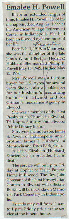 | Other | Age 80. Copher & Fesler Funeral Home, Elwood. Buried Oaklawn Memorial Park cemetery, Indianapolis. Died American Village Retirement Center, Indianapolis after a long illness. Parents: James W. and Bertha Hedrick Hubbard. Fashion buyer at Ayres; bookkeeper. |