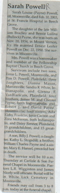 Other Daughter of the late William Bradley and Bessie Lulina (Bullock) Payne, she was born in Mount Vernon, Ky. Preceded in death by a son, Billy J. Powell; a daughter, Kathy L. Stogsdill; a brother, William Charles Payne; and a sister, Mary E. Hansel.