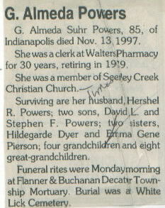 | Survived By | Husband; sons, David I. and Stephen F. Powers; sisters, Hildegarde Dyer and Emma Gene Pierson. |
