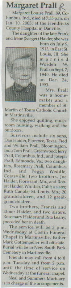 | Survived By | Six sons, Dan Haider, and Fred, William, Tom, Jerry, and Joseph Prall; 2 daughters, Rosemary Prall and Peggy Weddle; 2 brothers, Joe Haider and Robert Haider; sister, Ruth Canola; 20 grandchildren; 12 great-grandchildren. |